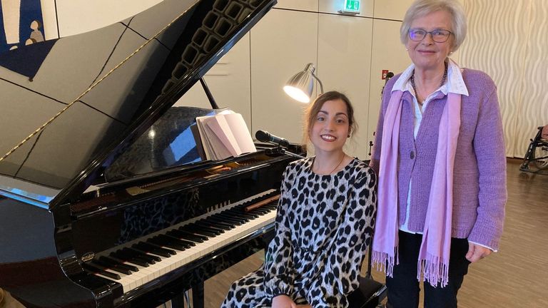 Drei Jahre später war Zoia nun im April 2023 wieder zu Gast in Deutschland. Neben der Nachkontrolle durch verschiedene Ärzte stand die Erneuerung ihrer Hilfsmittel – Rollstuhl, Orthesen, Spezialschuhe – auf dem Programm. Wie schon 2020 konnte die inzwischen 21-jährige junge Frau hierfür wieder auf den großen Beistand von Freunden und Förderern zählen. Zum Dank lud Zoia kurz vor ihrer Abreise am 8. Mai 2023 zu einem Klavierkonzert im Albertinen Haus ein (Foto mit Elisabeth Stiegler, Organisatorin der Spendenaktion für Zoia). Und sie hatte erfreuliche Nachrichten im Gepäck: In Georgien unterstützt sie inzwischen andere junge Menschen mit Behinderung zum Beispiel dabei, sich mit einem Rollstuhl zurechtzufinden, indem sie ihr Wissen aus der Reha weitergibt. Eine wichtige Hilfe in einem Land, in dem die Bedürfnisse von Menschen mit Behinderung sonst viel zu oft übersehen werden.