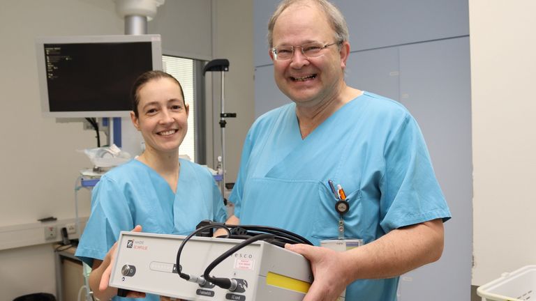 Manchmal muss so eine Kralle aber wieder entfernt werden, wenn sie zum Beispiel nicht ganz richtig sitzt. Zu diesem Zweck gibt es im Albertinen Krankenhaus nun einen Gleichstromgenerator, mit dem die Nahtstelle des Clips bearbeitet wird. Die „Bärenkralle“ kann dadurch schnell entfernt werden, was den Patientinnen und Patienten Folgebehandlungen erspart und ihre Genesung beschleunigt.